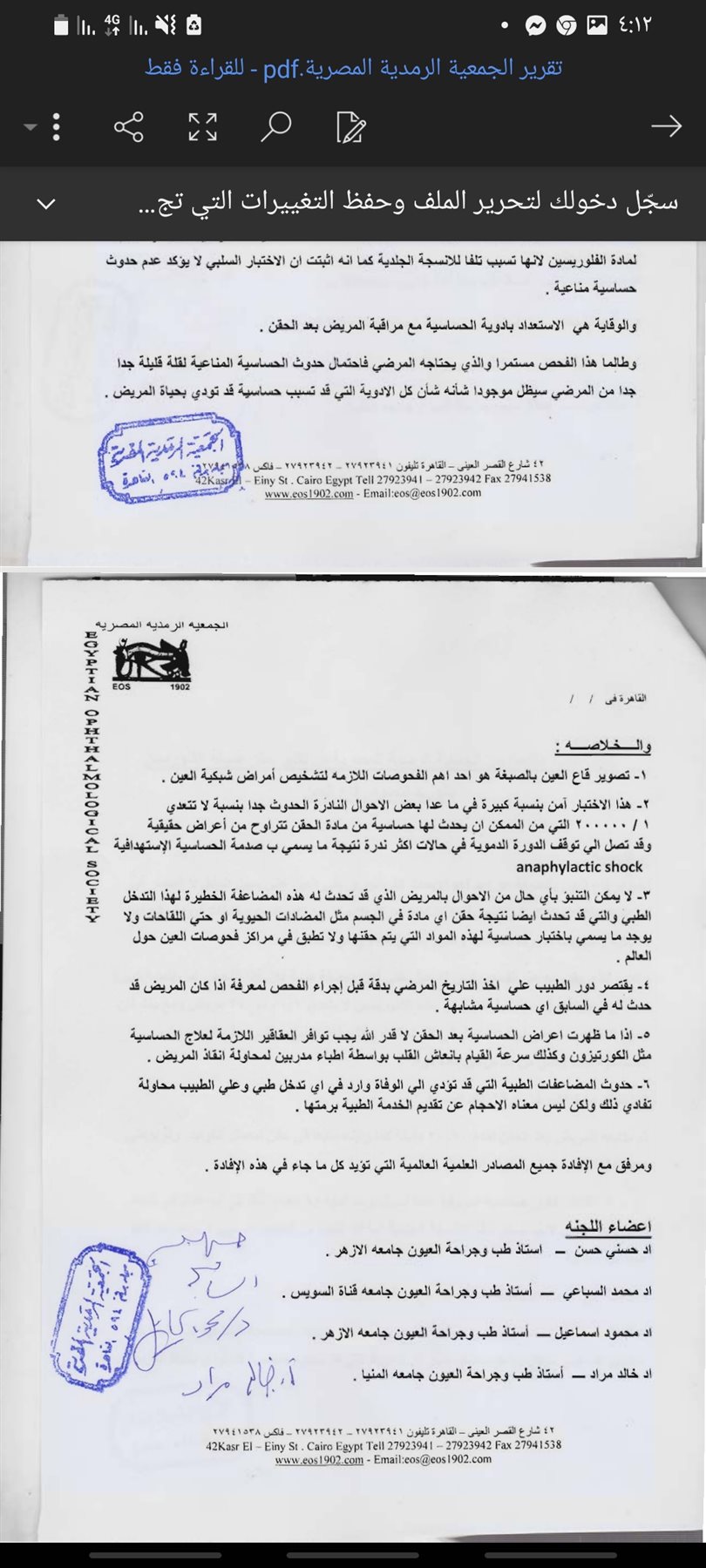 وقال الدكتور مصطفي هاشم عضو مجلس النقابة العامة للأطباء، وأستاذ ورئيس قسم الأشعة التشخيصية بكلية طب أسيوط، إن صبغة الفلورسين التي يتم حقنها لتصوير قاع العين لا يوجد لها اختبار حساسية متعارف عليه على مستوى العالم قبل إعطائها.
