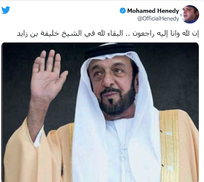 ونشر الفنان محمد هنيدي صورة لـ الرئيس الراحل ينعيه فيها، وذلك عبر حسابه الشخصي بموقع التدوينات القصيرة تويتر، معلقا عليها: إن لله وإن إليه راجعون، البقاء لله في الشيخ خليفة بن زايد.