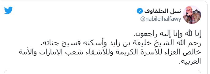 كما نعى الفنان نبيل الحلفاوي أيضًا؛ الرئيس الراحل، من خلال حسابه الشخصي بموقع تويتر، إذ كتب: إنا لله وإنا إليه راجعون، رحم الله الشيخ خليفة بن زايد وأسكنه فسيح جناته، خالص العزاء للأسرة الكريمة وللأشقاء شعب الإمارات والأمة العربية.