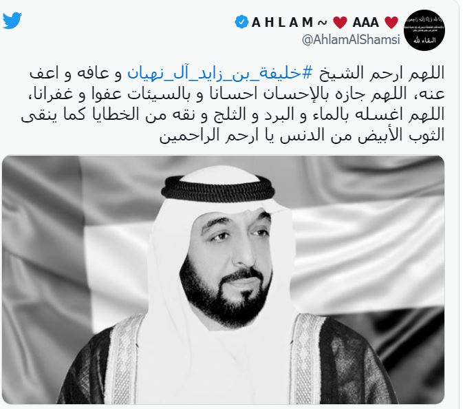 أما الفنانة الإماراتية أحلام، فقد نشرت صورة لآية قرآنية، عبر حسابها الشخصي بموقع تويتر، ثم نشرت صورة لـ الرئيس خليفة بن زايد، وعلقت عليها: اللهم ارحم الشيخ خليفة بن زايد آل نهيان وعافه واعف عنه.. اللهم جازه بالإحسان إحسانا وبالسيئات عفوًا وغُفرانا.. اللهم اغسله بالماء والبرد والثلج ونقه من الخطايا كما يُنقى الثوب الأبيض من الدنس يا ارحم الراحمين.