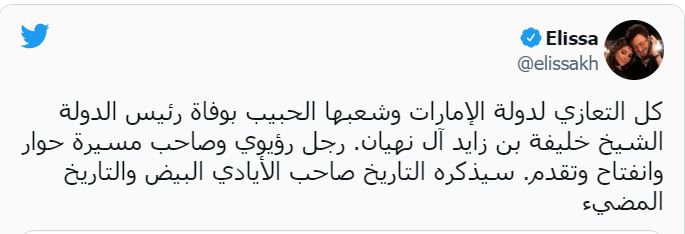 كما نشرت الفنانة إليسا صورة لـ الرئيس الراحل، تنعي شعب الإمارات، وذلك عبر حسابها الشخصي بـ تويتر، قائلة: كل التعازي لدولة الإمارات وشعبها الحبيب بوفاة رئيس الدولة الشيخ خليفة بن زايد آل نهيان.. رجل رؤيوي وصاحب مسيرة حوار وانفتاح وتقدم.. سيذكره التاريخ صاحب الأيادي البيض والتاريخ المضيء