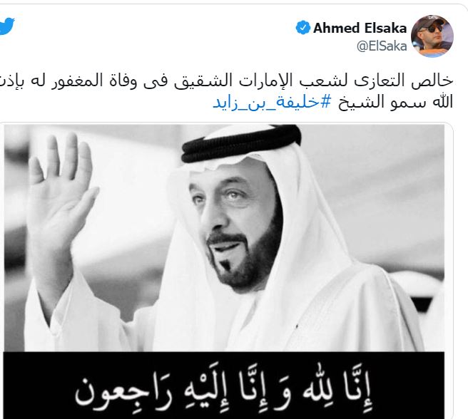 فيما نشر أحمد السقا أيضا نعى للرئيس الراحل عبر حسابه بـ تويتر، معلقا عليها: خالص التعازى لشعب الإمارات الشقيق في وفاة المغفور له بإذن الله سمو الشيخ.