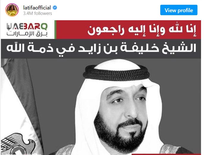 ونشرت الفنانة لطيفة خبر وفاة رئيس دولة الإمارات، وذلك عبر حسابها الشخصي بـ موقع الصور والفيديوهات انستجرام، قائلة: وزارة شؤون الرئاسة تنعى إلى شعب دولة الإمارات والأمتين العربية والإسلامية والعالم أجمع؛ قائد الوطن وراعي مسيرته صاحب السمو الشيخ خليفة بن زايد آل نهيان رئيس الدولة؛ الذي انتقل إلى جوار ربه راضيا مرضيا اليوم الجمعة 13 مايو.