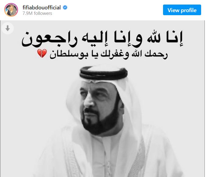 وعلقت فيفي عبده على خبر وفاة الشيخ خليفة بن زايد، وقدمت واجب العزاء للشعب الإماراتي، وذلك عبر حسابها الشخصي بـ موقع الصور والفيدوهات انستجرام، حيث قالت: تعازينا الحارة لشعب الامارات الحبيب في وفاة الشيخ خليفة بن زايد رئيس الدولة.