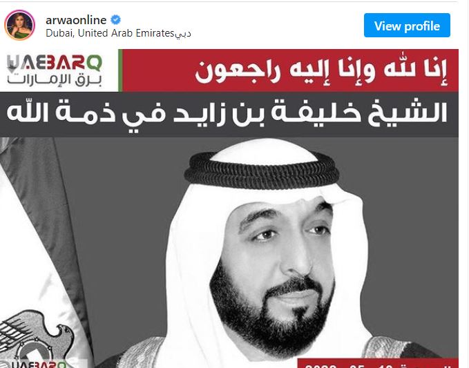 وقدمت المذيعة والفنانة أروى، واجب العزاء أيضًا في الرئيس الراحل، من خلال حسابها الشخصي بـ موقع انستجرام، إذ قالت: أتقدم بخالص العزاء للإمارات شعبا وحكومة وللعالم العربي بوفاه قائد الإمارات وحاكمها الشيخ خليفة بن زايد رحمه الله، وتقبله في فسيح جناته.