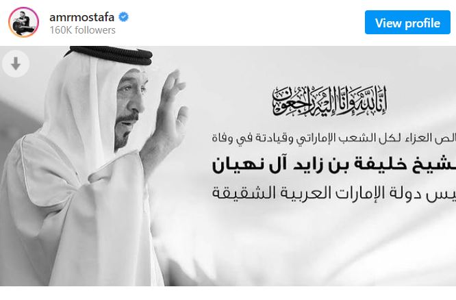 ونشر الملحن عمرو مصطفى، عبر حسابه الششخصي بـ بموقع الصور والفيديوهات انستجرام، صورة للرئيس الراحل خليفة بن زايد آل نهيان، ينعى فيها شعب دولة الإمارات والأمة العربية، معلقا عليها: أتقدم بخالص التعازي للشعب الإماراتي الشقيق في وفاة رئيس دولة الإمارات الشقيق، وإنا لله وإنا إليه راجعون.