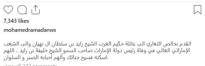 وقدّم الفنان محمد رمضان واجب العزاء أيضا، وذلك عبر حسابه الشخصي بـ موقع انستجرام، ونشر صورة للرئيس الراحل، معلقا عليها: أتقدم بخالص التعازي إلى عائلة حكيم العرب الشيخ زايد بن سلطان آل نهيان وإلى الشعب الإماراتي الغالي في وفاة رئيس دولة الإمارات صاحب السمو الشيخ خليفة بن زايد.. اللهم اسكنه فسيح جناتك وألهم أحبابه الصبر والسلوان.