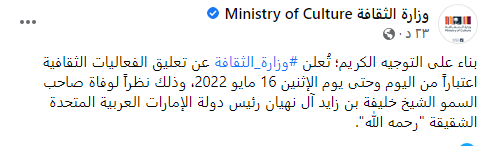 وقالت وزارة الثقافة السعودية، في بيان لها، عبر حسابها على فيسبوك: بناءً على التوجيه الكريم، تعلن وزارة الثقافة عن تعليق الفعاليات الثقافية اعتبارًا من اليوم وحتى يوم الإثنين 16 مايو 2022، وذلك نظرًا لوفاة صاحب السمو الشيخ خليفة بن زايد آل نيهان رئيس دولة الإمارات العربية المتحدة الشقيقة رحمة الله عليه.