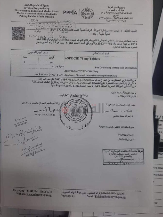 وزيادة سعر الأسبوسيد 75 مجم من 6 جنيه إلى 8 جنيهات، بما يعادل زيادة بنسبة 25%، وهو عبارة عن مضاد للالتهابات تخفيف الألم الخفيف إلى المتوسط.