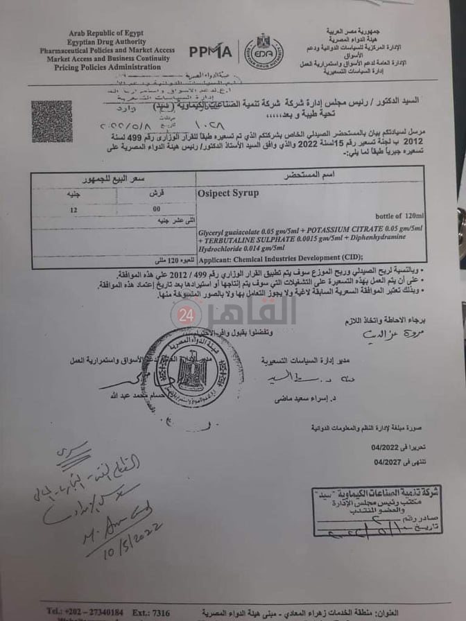 وزيادة سعر مستحضر اوسيبكت شراب 120 مللي من 9 جنيهات إلى 12 جنيها، بما يعادل زيادة بنسبة 25%، ويستخدم لعلاج الالتهاب الشعبي الحاد والمزمن والربو الشعبي، والحالات التي يصاحبها ضيق في الممرات التنفسية والكحة المصاحبة لحالات عدوى الجهاز التنفسي، كما في نزلات البرد والتهاب الجيوب الأنفية، وكذلك التهاب الحلق خاصة إذا كانت تلك الحالات مصحوبة بإفرازات مخاطية.