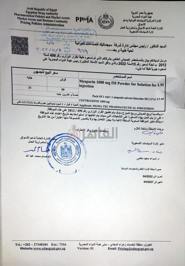 وزيادة سعر مستحضر سيجماتاكسيم حقن من 16.50 جنيه إلى 20.50 جنيه، بما يعادل زيادة بنسبة 19.5%، وهو عبارة عن مضاد حيوي، يستخدم في عدوى الجهاز الهضمي: النزلات المعوية البكتيرية، عدوى البطن البكتيرية، التهاب الغشاء البريتونى، علاج وقائي في العناية المركزة وبعد العمليات الجراحية، ولاسيما الولادة القيصرية، عدوى الجهاز التنفسي السفلي: الالتهاب الرئوي، التهاب الشعب الهوائية، التهاب لسان المزمار البكتيري، عدوى الجهاز البولي التناسلي كالتهاب الكلية وحوضها والتهاب عنق الرحم.