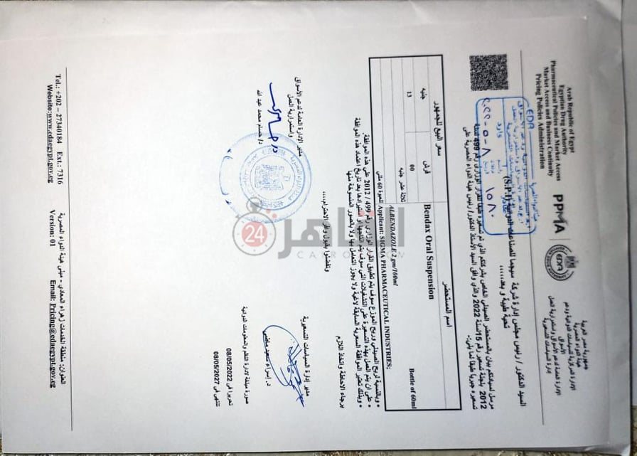 وزيادة سعر مستحضر بنداكس شراب من 10.50 جنيه إلى 13 جنيها، بنسبة تعادل 19%، وهو عبارة عن مضاد للديدان المعدة.