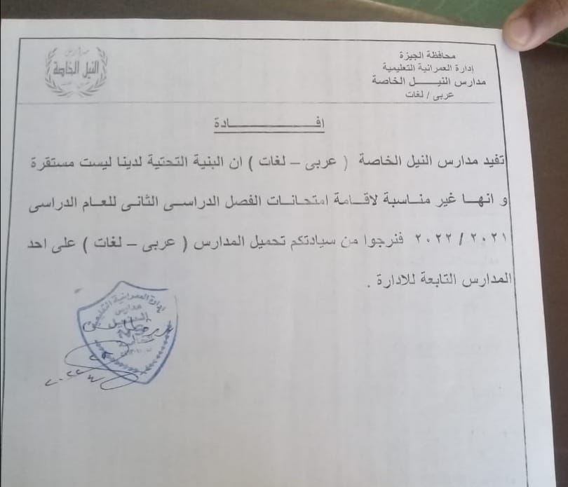 وأفاد مالك مدارس النيل الخاصة، بشأن عدم جاهزية مدرسة النيل لعقد الامتحانات إلكترونيا، مما أدى إلى التحاقهن لآداء الامتحان بالمدارس الحكومية، وبناء عليه تم إصدار أمر تكليف لجميع المدارس الخاصة بنطاق المحافظة، بالانتهاء من تجهيز مدارسهم من البنية التكنولوجية، حتى يتمكن الطلاب من الامتحان أسوة بعدد 100 مدرسة جاهزة، لعقد الامتحان داخل المحافظة.