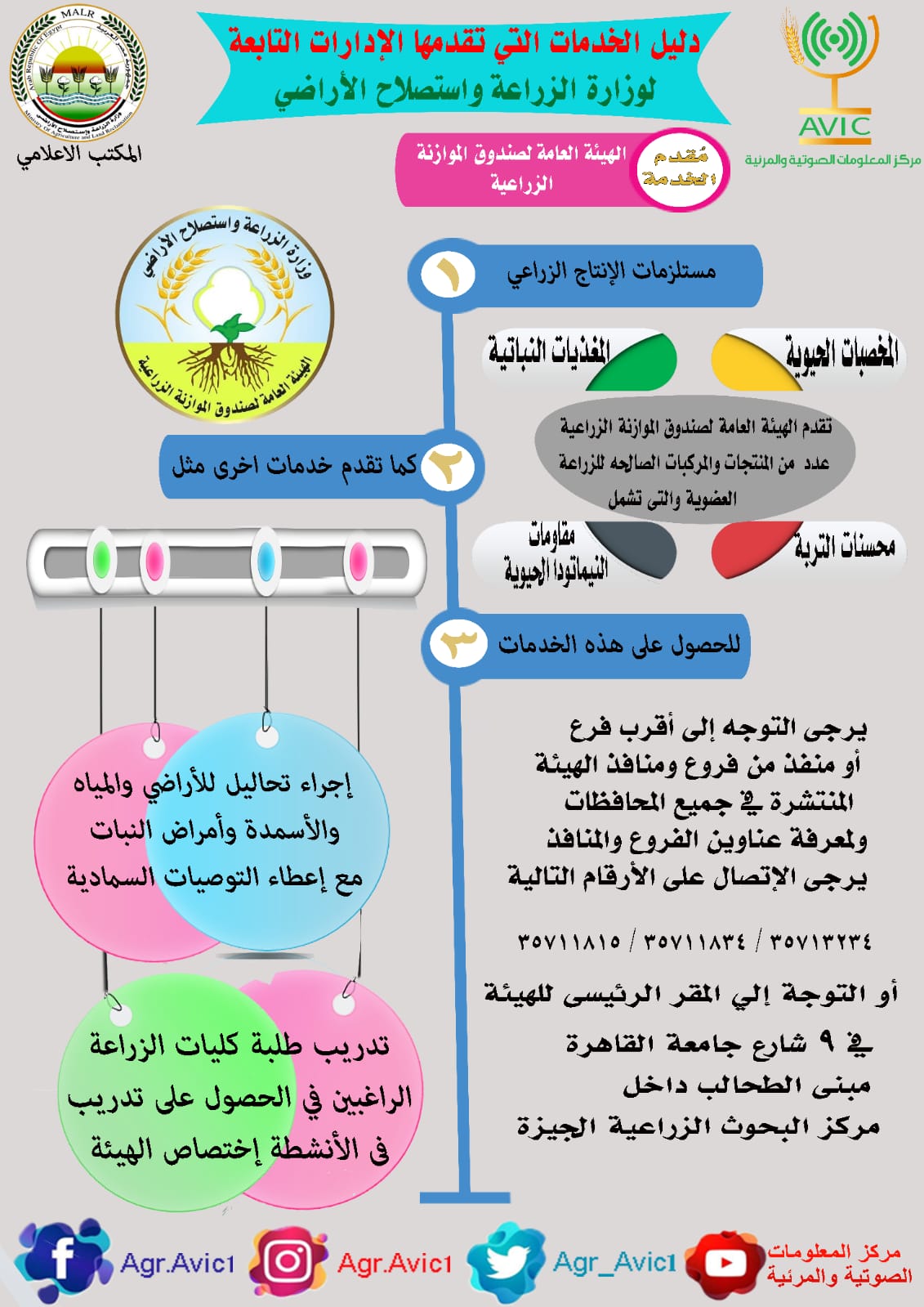 أصدر مركز المعلومات الصوتية والمرئية بوزارة الزراعة واستصلاح الأراضي، والمكتب الإعلامي للوزارة، العدد الثامن من سلسلة دليل الخدمات التي تقدمها الإدارات التابعة للوزارة، للمزارع والمربي والمواطن، حيث يستعرض هذا العدد من خلال فيديو وإنفوجراف، الخدمات التي تقدمها الهيئة العامة لصندوق الموازنة الزراعية، والإجراءات الواجب اتباعها للحصول على هذه الخدمات.