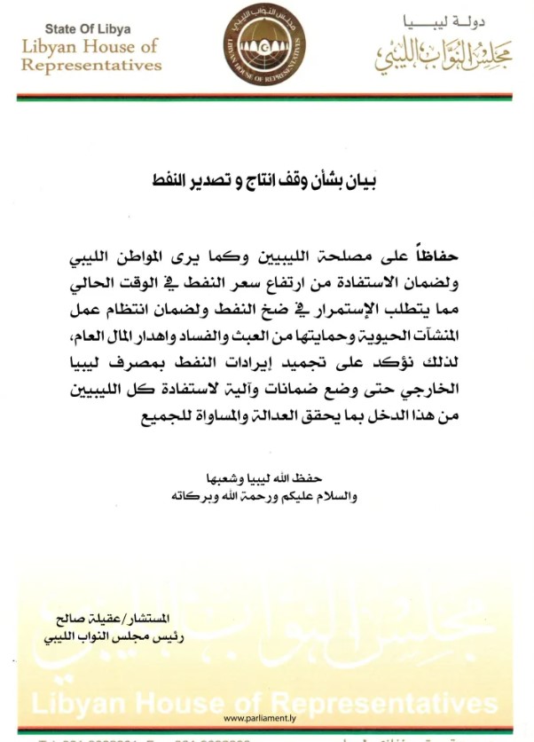 أعلن مجلس النواب الليبي تجميد إيرادات النفط بمصرب ليبيا الخارجي، لحين الفصل في آلية توزيع عادلة للإيرادات النفطية، ولضمان الاستفادة من ارتفاع أسعار النفط عالميًا.