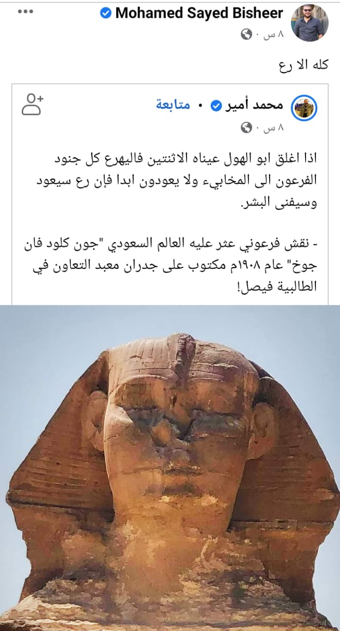 وشارك السيناريست محمد سيد، منشورًا لمتابعيه لصورة أبو الهول مُغمض عينيه، علق عليها: كله إلا رع.
