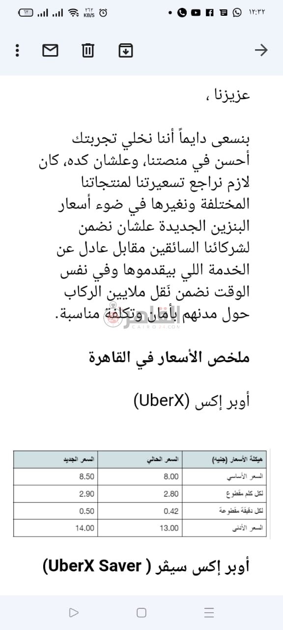 وأشارت الرسالة إلى ارتفاع سعر فتحة العداد في رحلات أوبر اكس من 8 جنيهات إلى 8.50 جنيه، وسعر الكيلو متر من 280 قرشا إلى 290 قرشا وسعر الدقيقة من 42 قرشا إلى 50 قرشا وأصبح الحد الأدنى للرحلة 14 جنيه بدلا من 13 جنيها.