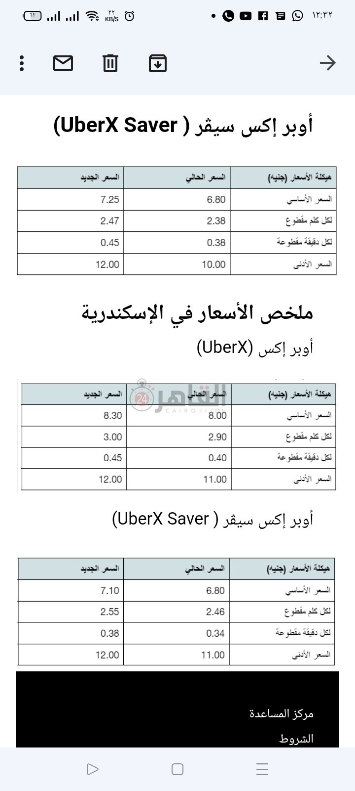 وارتفع سعر بداية الرحلة في خدمة أوبر اكس من 8 جنيهات إلى 8.30 جنيه في الإسكندرية، وسعر الكيلو الواحد أصبح 3 جنيهات بدلا من 2.90 جنيه، وسعر الدقيقة من 40 إلى 45 قرشا، والحد الأدنى للرحلة 12 جنيها بدلا عن 11 جنيها.