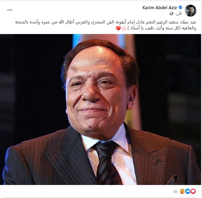 وكتب كريم عبد العزيز منشورًا، عبر حسابه الشخصي بموقع التواصل الاجتماعي فيس بوك، قائلًا: عيد ميلاد سعيد الزعيم النجم عادل إمام، أيقونة الفن المصري والعربي، آطال الله في عمره، وأمده بالصحة والعافية، كل سنة وأنت طيب يا أستاذ.