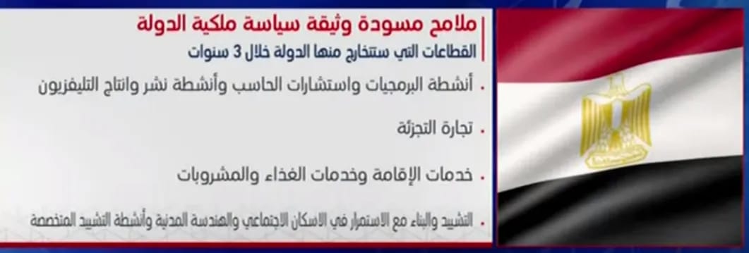 وقالت الحديدي إن المسودة الخاصة بالوثيقة قسمت القطاعات لثلاثة قطاعات رئيسية، أولها قطاعات تتخارج منها الدولة كلية خلال ثلاث سنوات مثل زراعة الحبوب، ما عدا القمح والاستزراع السمكي والثروة الحيواني والموانئ الجافة والبرية والنقل البحري ومحطات تحلية المياه من قطاع مياه الشرب والقطاع الخاص أكثر كفاءة في ذلك، وعدد من أنشطة البرمجيات والحاسب ونشر وإنتاج التلفزيون وتجارة التجزئة خدمات الإقامة والغذاء والمشروبات، والتشييد والبناء فيما عدا الإسكان الاجتماعي وغيرها.