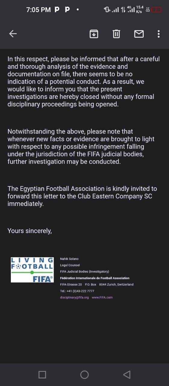 وأختتم عادل تصريحاته: الثنائي متواجدين في النادي وتعاقدهم ساري مع نادي إيسترن كومباني، والنادي تلقى إخطارًا من فيفا يوم 11 من الشهر الجاري.