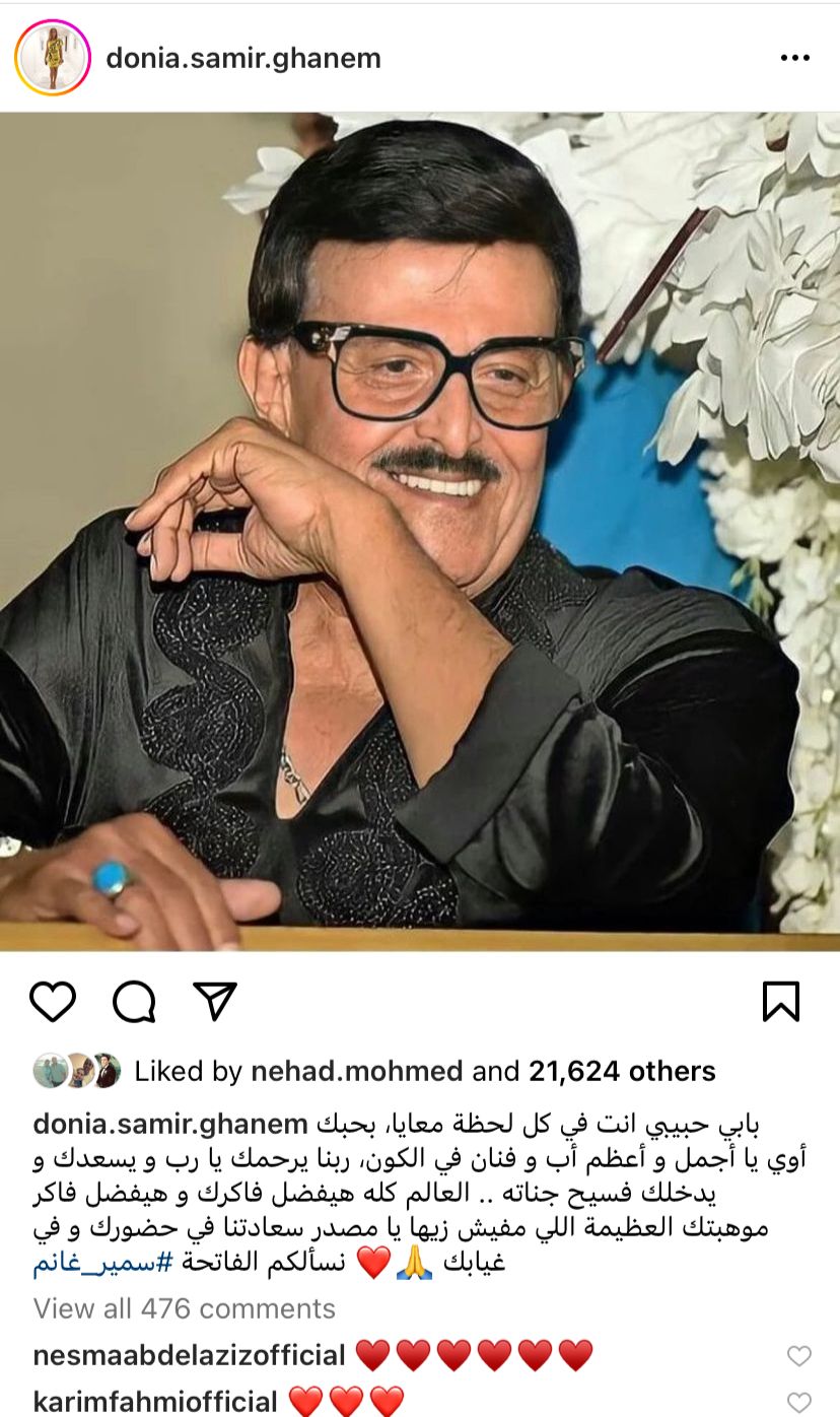 كتبت الفنانة دنيا سمير غانم عبر صفحتها الشخصية إنستجرام في الذكرى الأولى لوفاة والدها النجم سمير غانم قائله: بابي حبيبي انت في كل لحظة معايا، بحبك أوي يا أجمل وأعظم أب وفنان في الكون، ربنا يرحمك يا رب ويسعدك ويدخلك فسيح جناته.. العالم كله هيفضل فاكر موهبتك العظيمة اللي مفيش زيها مصدر سعادتنا في حضورك وفي غيابك نسألكم الفاتحة.