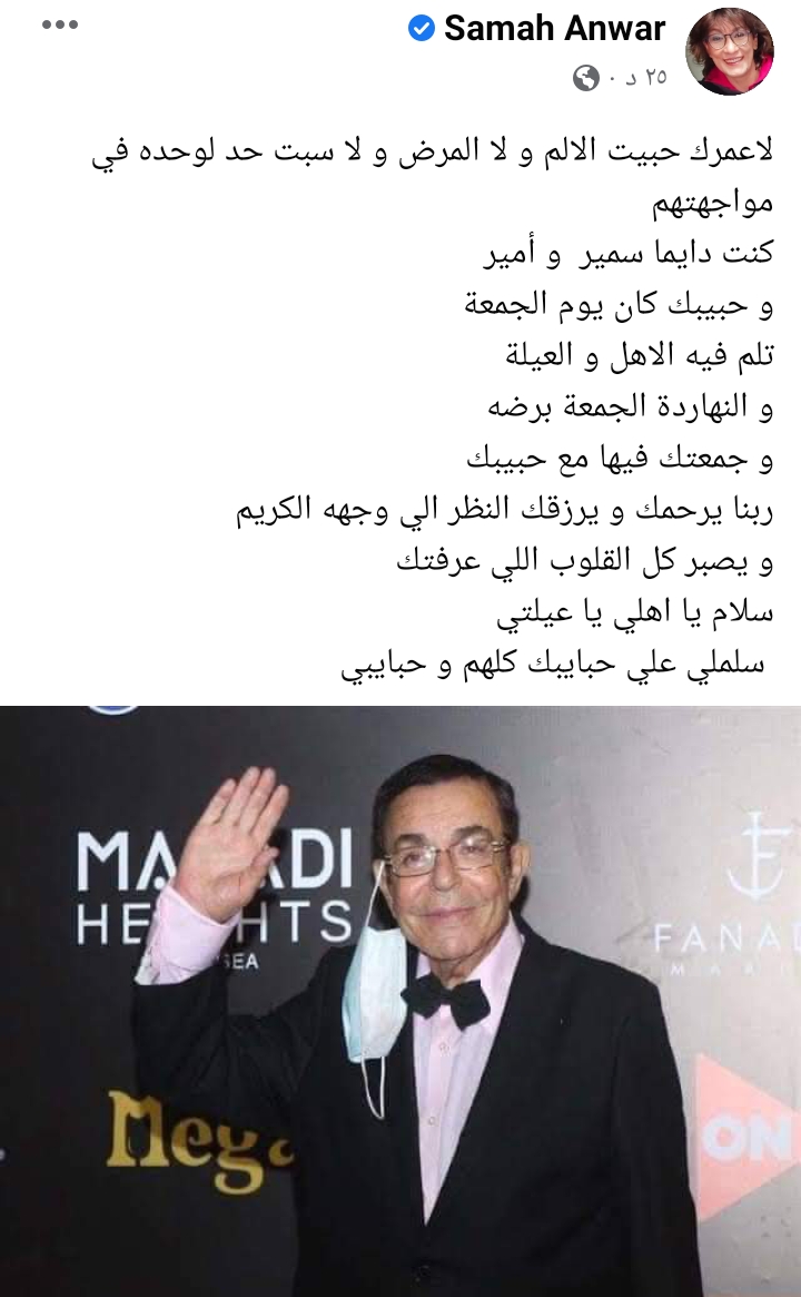 وشاركت سماح أنور، متابعيها صورة، لـ سمير صبري، عبر موقع التواصل الاجتماعي فيس بوك، معلقة: لا عمرك حبيت الألم ولا المرض ولا سبت حد لوحده في مواجهتهم.. كنت دايمًا سمير وأمير، وكان يوم الجمعة تلم فيه الأهل والعيلة، والنهاردة الجمعة برضه، وجمعتك فيها مع حبيبك.
