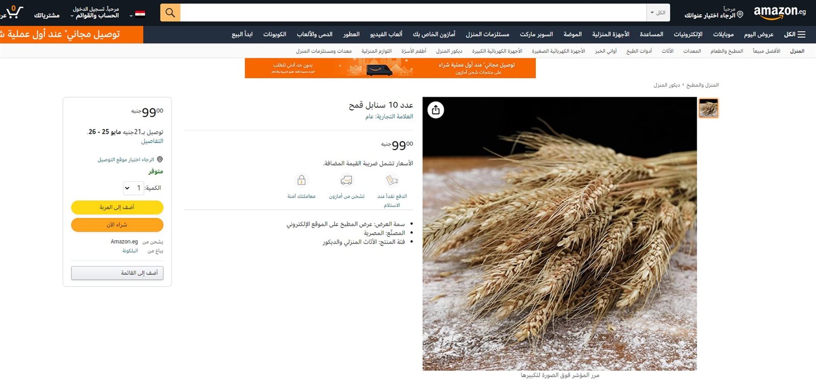 عرض موقع أمازون بيع عدد 10 سنابل قمح بقيمة 99 جنيها فضلا عن 21 جنيها خدمة التوصيل بينما عرض أيضا عدد 6 سنابل قمح ريش صناعي بقيمة 141 جنيها متضمنة خدمة التوصيل، وهذه المنتجات مصنفة ضمن تصنيفات ديكور المنزل والإكسسوارات.