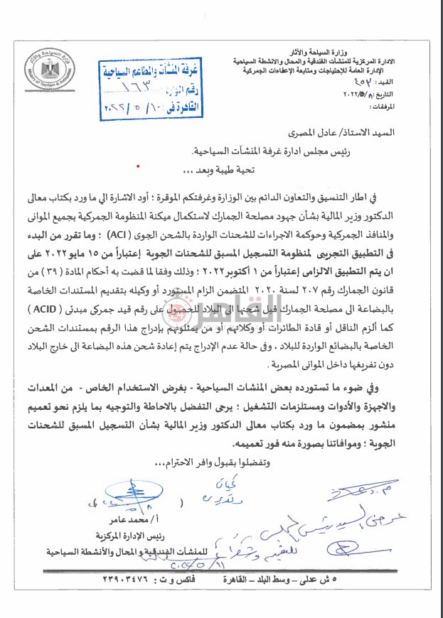 وأوضح عامر، أنه سيتم إلزام الناقل أو قادة الطائرات أو وكلائهم أو من يمثلونهم بإدراج هذا الرقم بمستندات الشحن الخاصة بالبضائع الواردة للبلاد وفي حالة عدم الإدراج يتم إعادة شحن هذه البضاعة إلى خارج البلاد دون تفريغها داخل الموانئ المصرية، وفي ضوء ما تستورده بعض المنشآت السياحية بغرض الاستخدام الخاص من المعدات والأجهزة والأدوات ومستلزمات التشغيل يرجى التفضل بالإحاطة والتوجيه بما يلزم نحو تعميم منشور وزير المالية بشأن التسجيل المسبق للشحنات الجوية؛ وموافاتنا بصورة منه فور تعميمه.
