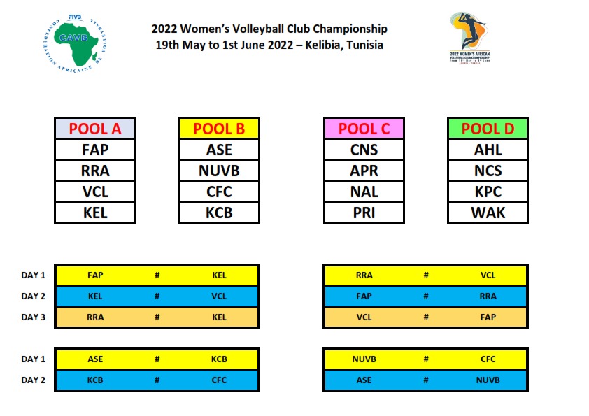 أسفرت قرعة بطولة إفريقيا للأندية، عن وقوع الفريق الأول للكرة الطائرة للسيدات بالنادي الأهلي في المجموعة الرابعة، بالبطولة التي تقام في مدينة قليبية بتونس، إلى جانب فرق الجمارك النيجيري، والأنابيب الكيني، والواك الغاني.