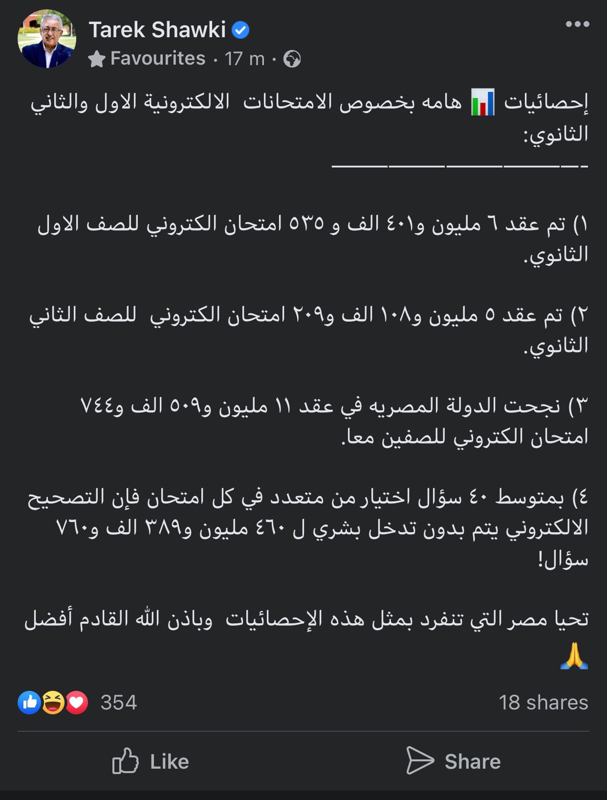 نشر الدكتور طارق شوقي، وزير التربية والتعليم والتعليم الفني، احصائيات هامة بخصوص الامتحانات الالكترونية الاول والثاني الثانوي لنهاية العام للعام الدراسي الجاري.