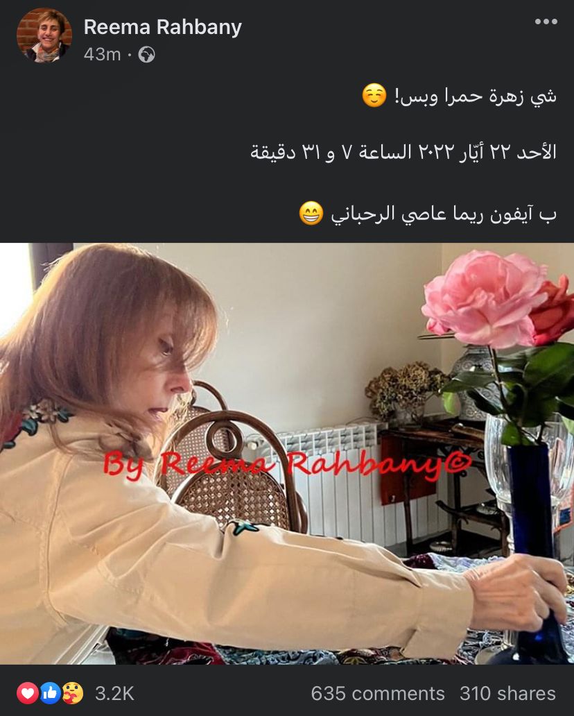 وعلقت ريما، على الصورة التي نشرتها عبر حسابها الشخصي بموقع التواصل الاجتماعى فيسبوك، كاشفة عن توقيت التقاط الصورة، قائلة: شي زهرة حمرا وبس! الأحد 22 مايو 2022 الساعة 7و31 دقيقة.. بآيفون ريما عاصي الرحباني.