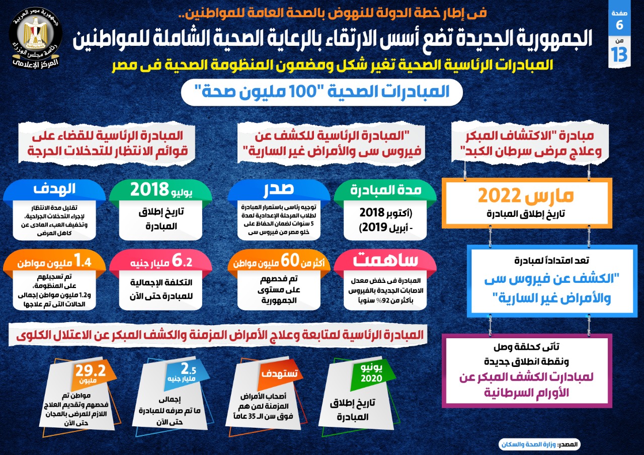 وأضاف التقرير أن المبادرة قد ساهمت في خفض معدل الإصابات الجديدة بالفيروس بأكثر من 92% سنويا، وتم فحص أكثر من 60 مليون مواطن على مستوى الجمهورية.
