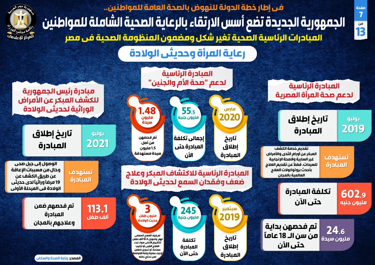 في السياق ذاته، تم إطلاق مبادرة رئيس الجمهورية للكشف المبكر عن الأمراض الوراثية لحديثي الولادة في يوليو 2021، بهدف الوصول إلى جيل صحي وخال من مسببات الإعاقة عن طريق الكشف عن 19 مرضًا وراثيًا لدى حديثي الولادة في المرحلة الأولى، وقد تم فحص 113.1 ألف طفل ضمن المبادرة وعلاجهم بالمجان.