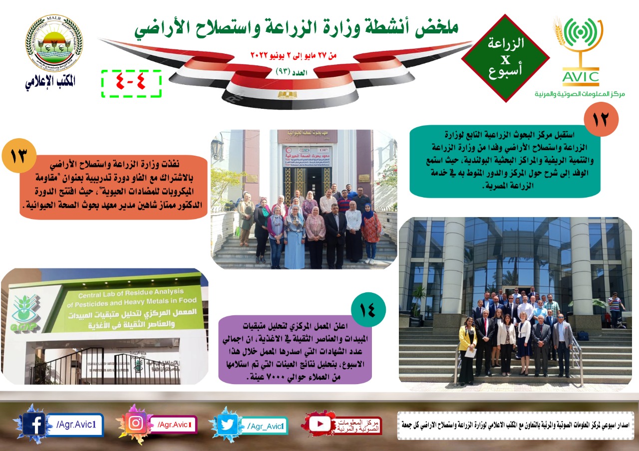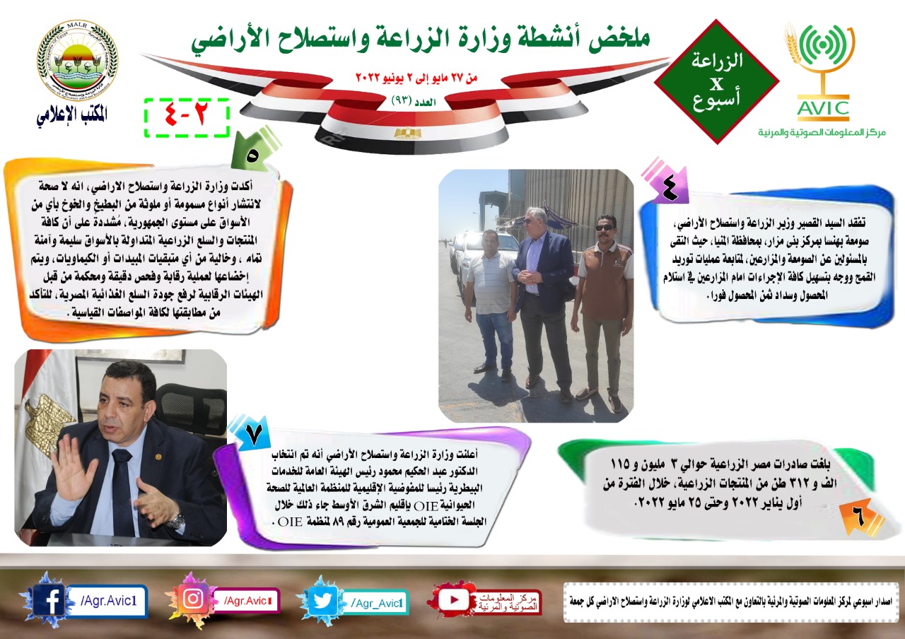 أصدر مركز المعلومات الصوتية والمرئية، التابع لوزارة الزراعة واستصلاح الأراضي، الانفوجراف الأسبوعي، في نسخته رقم 93، حول الحصاد الأسبوعي لأهم أنشطة الوزارة، خلال الأسبوع الماضي في الفترة من 27 مايو حتى 2 يونيو الجاري، وذلك بالتعاون مع المكتب الإعلامي للوزارة.