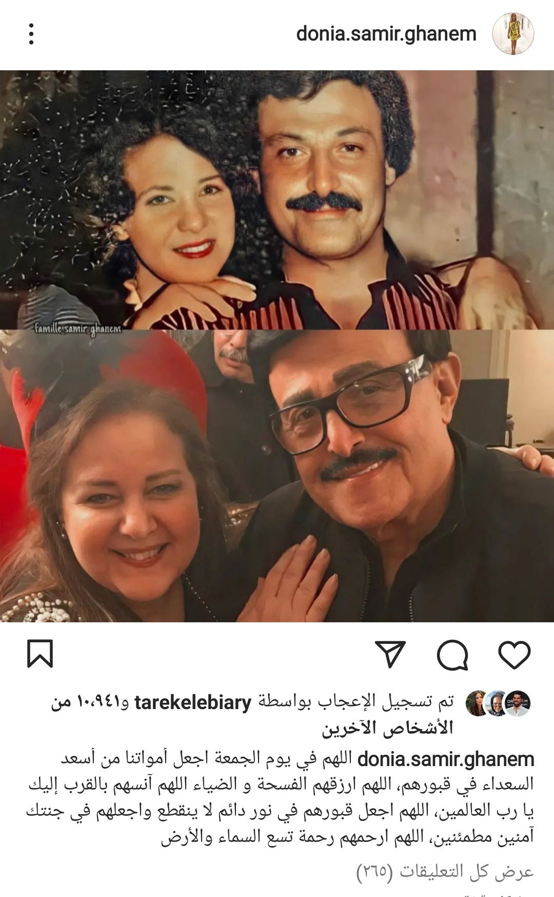 شاركت الفنانة دنيا سمير غانم متابعيها، ببعض الصور لوالديها الراحلين، دلال عبد العزيز وسمير غانم، تعرب من خلالها عن اشتياقها الكبير لهما، وتطالب الجميع بالدعاء لهما بالرحمة والمغفرة وأن يرزق الله كل محبيهم الصبر والسلوان في محنتهم.
