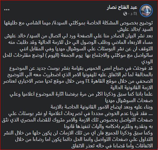 وتابع المحامي: فوجئت في صباح أمس الخميس، بقيامه بنشر بوست جديد عن الموضوع، بالمخالفة لما تم الاتفاق عليه تليفونيا، الأمر الذي اضطررت معه إلى التوضيح الصحفي، من خلال موقع القاهرة 24، لعناصر الأزمة القانونية الحالية، علما بأننا كما سبق وذكرنا أكثر من مرة، برفضنا إثارة الموضوع إعلاميا، وعلى صفحات السوشيال ميديا.