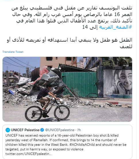 وكتبت المنظمة عبر حسابها الرسمي على تويتر: اليونيسف تلقت تقارير عن مقتل فتى فلسطيني يبلغ من العمر 16 عاما، بالرصاص يوم أمس، غربي رام الله، وفي حال تأكيد ذلك؛ يرتفع عدد الأطفال الذين قتلوا هذا العام في الضفة الغربية، إلى 14، مضيفة:الطفل هو طفل، ولا ينبغي أبدا استهدافه أو تعريضه للأذى أو للعنف.