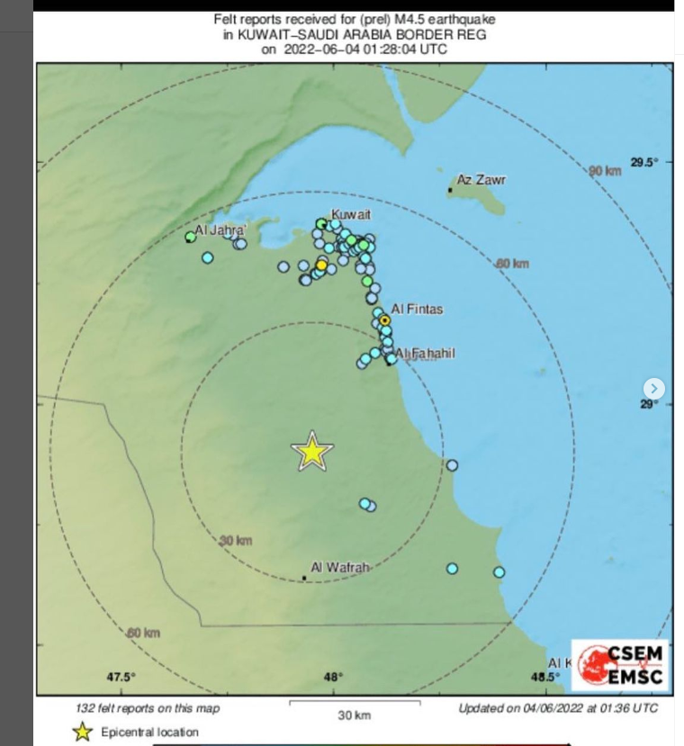 وكانت الشبكة الوطنية الكويتية لرصد الزلازل بمعهد الكويت للأبحاث العلمية، قد أعلنت عن وقوع زلزال هز بعض المناطق في الكويت، ليلة السبت.