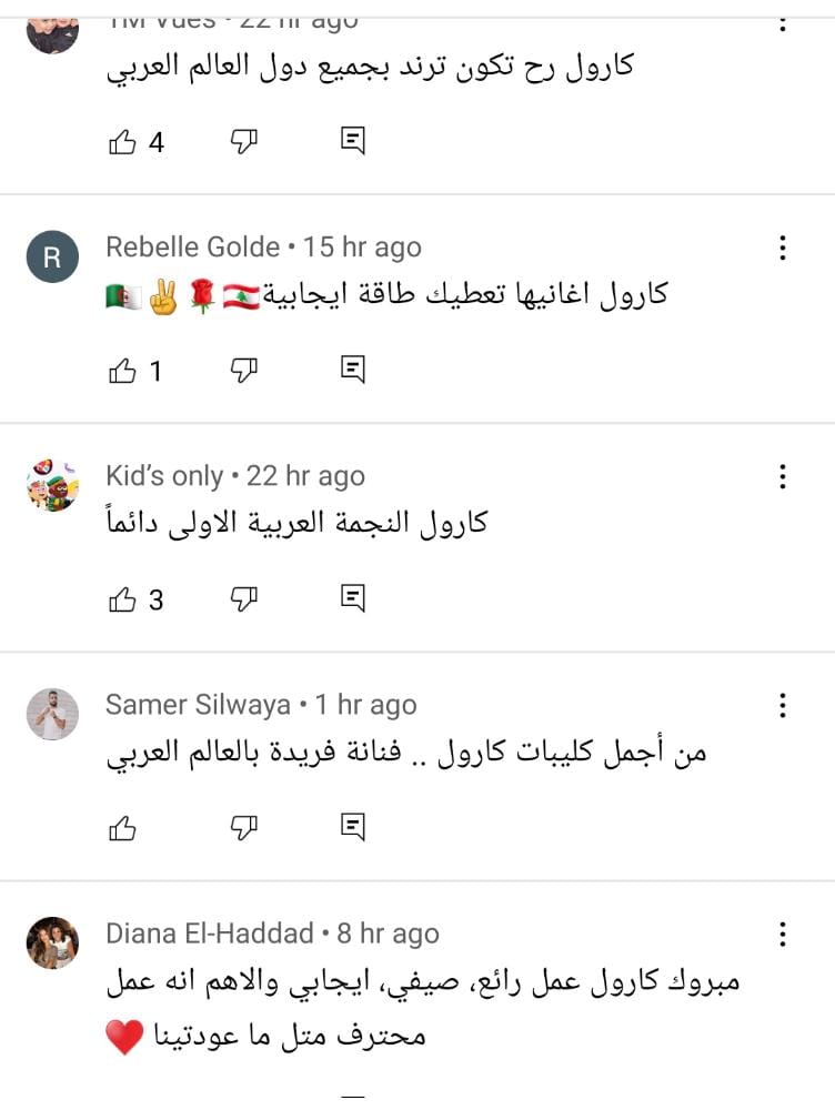 وكتب مستخدمو موقع الفيديوهات يوتيوب المزيد من التعليقات الإيجابية، ومنها كارول النجمة العربية الأولى دائما، من أجمل كليبات كارول، عمل رائع وإيجابي، صوت نقي لا أمل منه، كارول ناجحة جدا.
