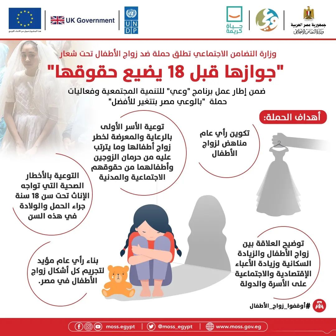 ونشرت الصفحة الرسمية لوزارة التضامن الاجتماعي، على موقع التواصل الاجتماعي فيسبوك، انفوجرافًا يوضح أهداف حملتها ضد زواج الأطفال جوازها قبل 18 يضيع حقوقها، والتي جاءت كالتالي: