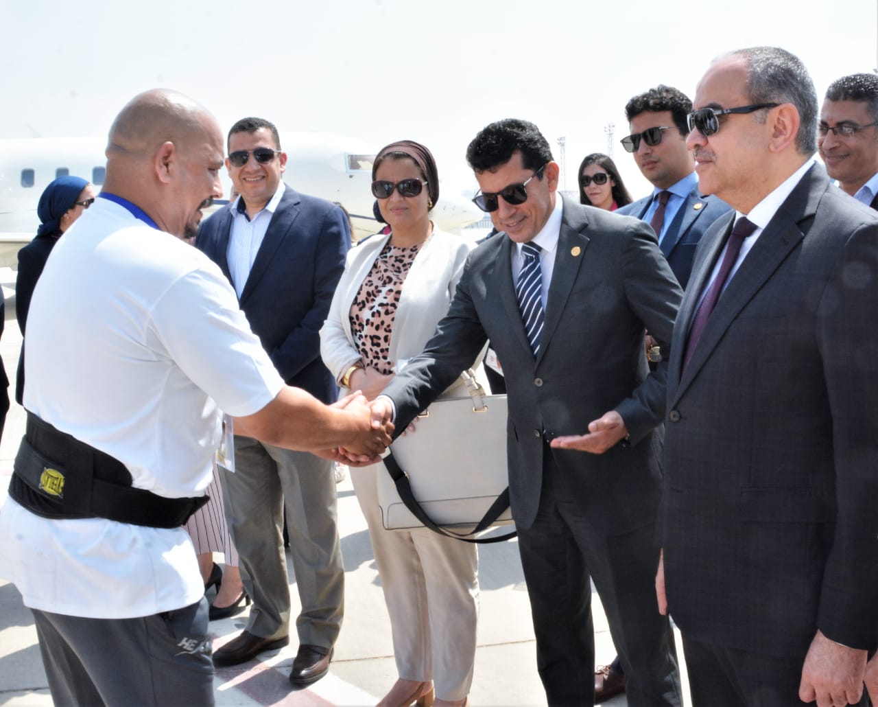 وزيرا الرياضة والطيران يشهدان العرض الاستعراضي لـ محمود لالا في سحب طائرة ركاب بأسنانه