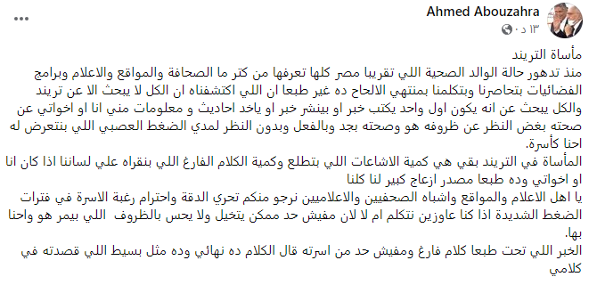 وكتب نجل عبد الرحمن أبو زهرة منشورا عبر حسابه الشخصي بموقع التواصل الاجتماعي فيس بوك، قال فيه: مأساة التريند، منذ تدهور حالة الوالد الصحية، اللي تقريبا مصر كلها تعرفها، من كتر ما الصحافة والمواقع والإعلام، وبرامج الفضائيات بتحاصرنا وبتكلمنا بمنتهى الإلحاح، ده غير طبعًا أن اللي اكتشفناه أن الكل لا يبحث إلا عن التريند، والكل يبحث عن أنه يكون أول واحد يكتب خبر، أو بينشر خبر أو ياخد أحاديث ومعلومات مني، أنا أو أخواتي عن صحته، بغض النظر عن ظروفه، هو وصحته بجد وبالفعل وبدون النظر لمدى الضغط العصبي، اللي بنتعرض له إحنا كأسرة.