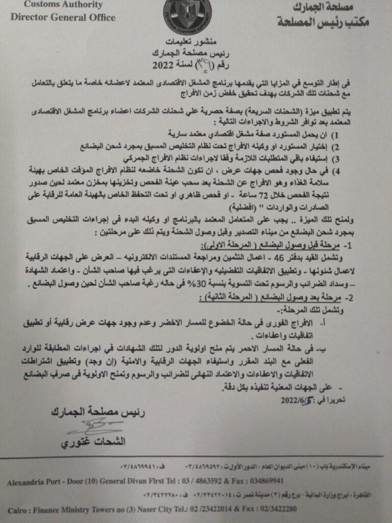 ووفق مستند حصل القاهرة 24 على نسخة منه، يتم تطبيق ميزة الشحنات السريعة بصفة حصرية، على شحنات الشركات أعضاء برنامج المشغل الاقتصادي المعتمد بعد توافر الشروط والإجراءات التالية: