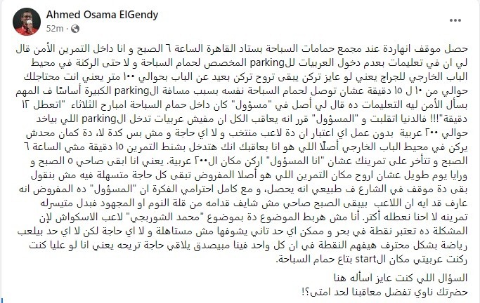 قال الجندي في منشوره عبر فيسبوك: حصل موقف النهاردةه عند مجمع حمامات السباحة باستاد القاهرة الساعة 6 الصبح، وأنا داخل التمرين، الأمن قال لي إن هناك تعليمات بعدم دخول العربيات للـ parking المخصص لحمام السباحة، ولا حتى الركنة في محيط الباب الخارجي للجراچ، يعني لو عايز تركن يبقى تروح تركن بعيد عن الباب بحوالي 100 متر يعني انت محتاجلك حوالي من 10 لـ 15 دقيقة عشان توصل لحمام السباحة نفسه بسبب مسافة الـ parking الكبيرة أساسًا.