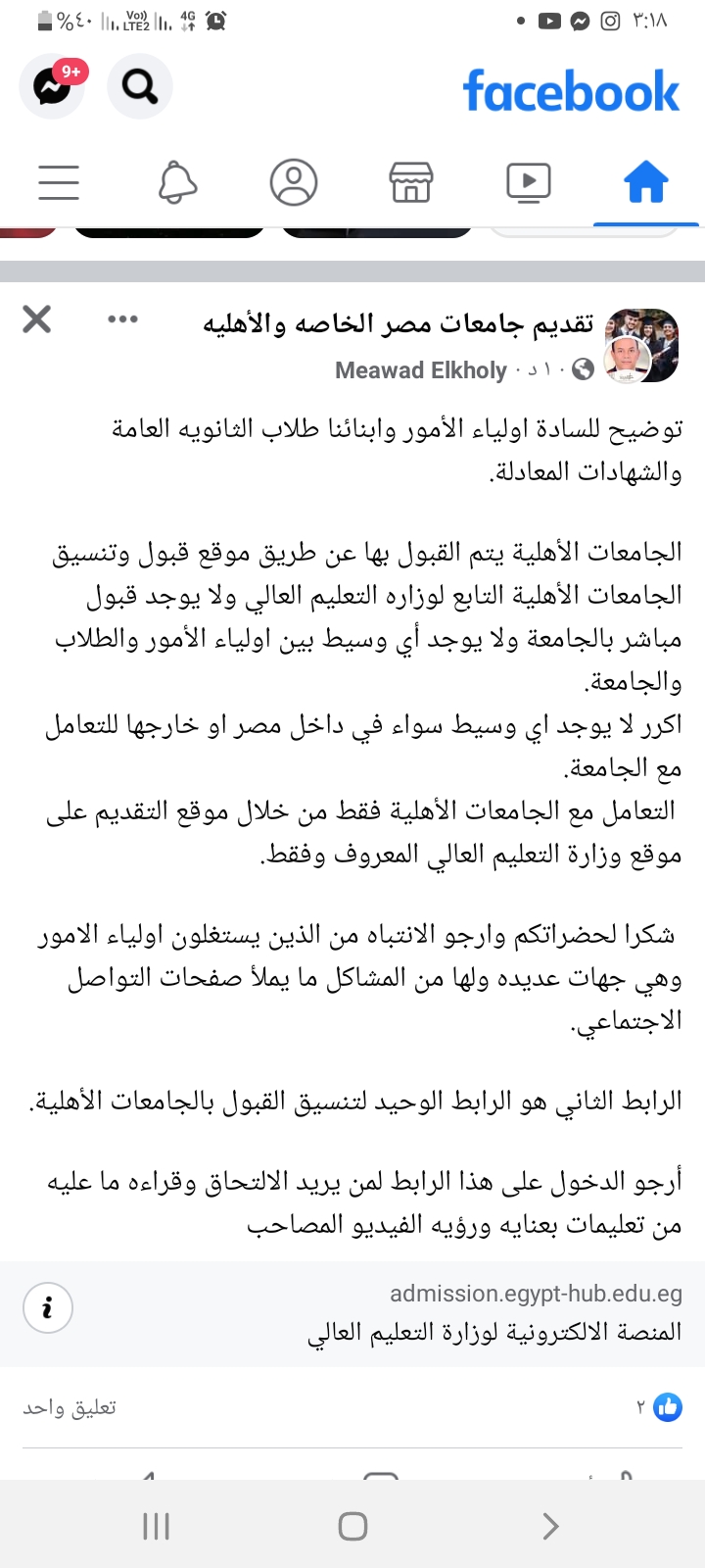 وشدد معوض الخولي، من خلال منشور لها عبر جروب الجامعات الأهلية على موقع فيسبوك، على عدم التعامل مع من يستغلون أولياء الأمور، قائلا: هي جهات عديدة، ولها من المشاكل ما يملأ صفحات التواصل الاجتماعي.