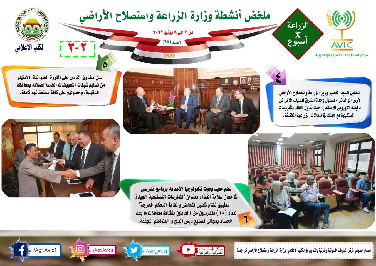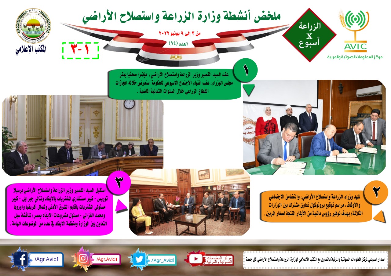 أصدر مركز المعلومات الصوتية والمرئية، التابع لوزارة الزراعة واستصلاح الأراضي، الانفوجراف الأسبوعي في نسخته رقم 94، حول حصاده لأهم أنشطة الوزارة، خلال الفترة من 3 وحتى 9 يونيو الجاري، وذلك بالتعاون مع المكتب الاعلامي للوزارة.