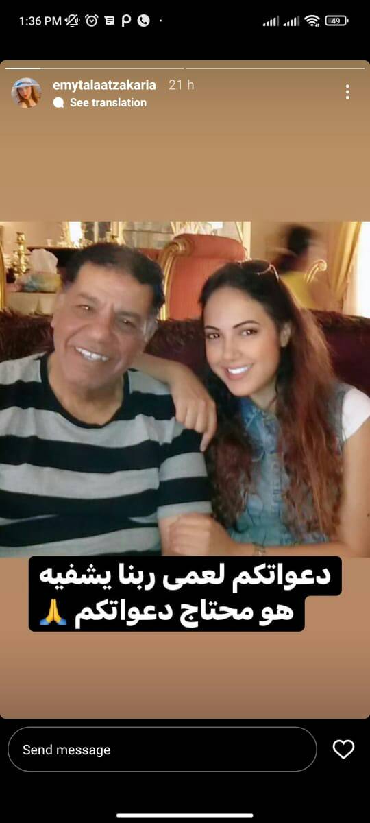 ونشرت إيمي طلعت زكريا صورة لها مع عمها عبر خاصية ستوري، لحسابها على موقع تبادل الصور والفيديوهات القصيرة انستجرام، معلقةً: دعواتكم لعمي ربنا يشفيه هو محتاج دعواتكم، كما طالب عمر شقيق إيمي من متابعيه التمني لعمه بالشفاء العاجل، وذلك عبر حسابه الشخصي بانستجرام.