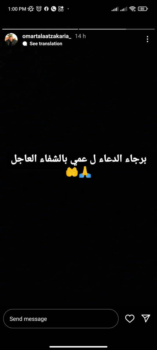 أعلن كل من عمر وإيمي طلعت زكريا إصابة عمهما بوعكة صحية، خلال الساعات الماضية، طالبين من متابعيهما الدعاء بالشفاء له.