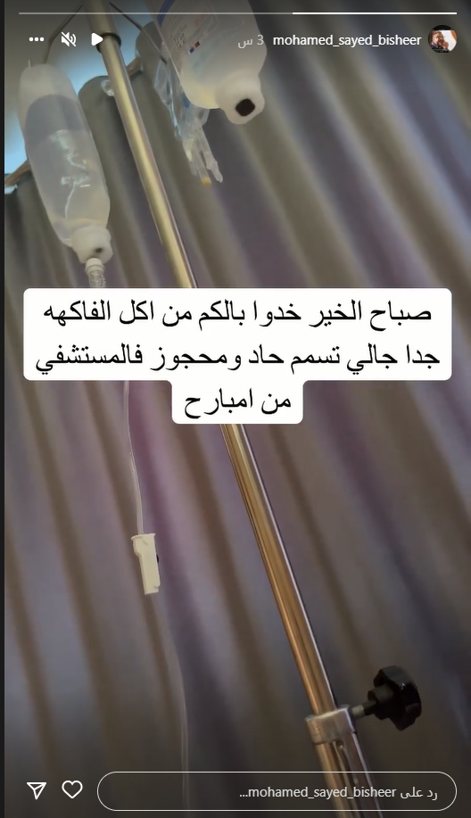 ونشر بشير مقطع فيديو من المستشفى، عبر خاصية ستوري لحسابه الشخصي على موقع تبادل الصور والفيديوهات القصيرة انستجرام، وعلق قائلًا: صباح الخير خدوا بالكم من أكل الفاكهة جدًا جالي تسمم حاد ومحجوز في المستشفى من امبارح.